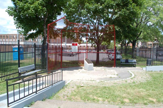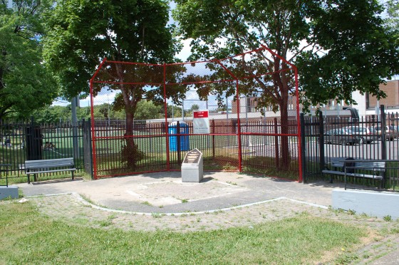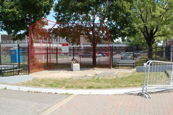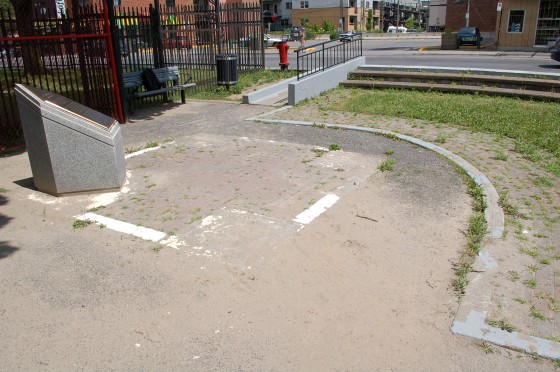 The statue of Jackie Robinson and the children were where the gaudy thigh high plaque that isn’t even close to being the correct dimensions of home plate is now. While they weren’t exactly where home plate would have been at Delorimier Downs, they were close enough. Now it’s just a joke, and a bad one at that.
